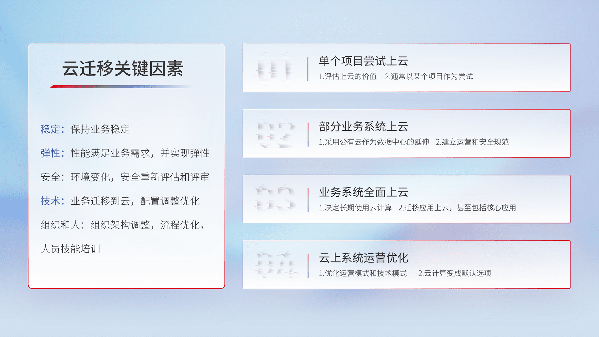 结合实际业务,,从规划设计、、云平台选型、、、、云原生改造、、、、数据迁移、、集成交付,,迁移全过程为客户识别最佳上云路径,,,做好风险识别管理,,,设计网络架构、、身份权限、、、安全审计合规、、、操作审计、、日志审计、、、、监控告警策略、、、、多站点容灾设计等,,,对云上基础设施进行整体规划,,提升IT治理水平,,以满足弹性、、、、高可用、、高性能的需求。。