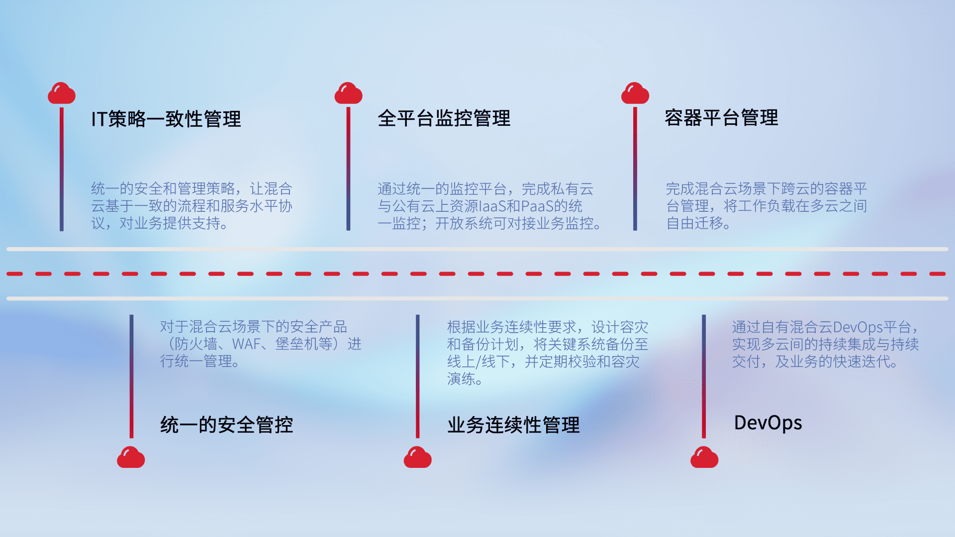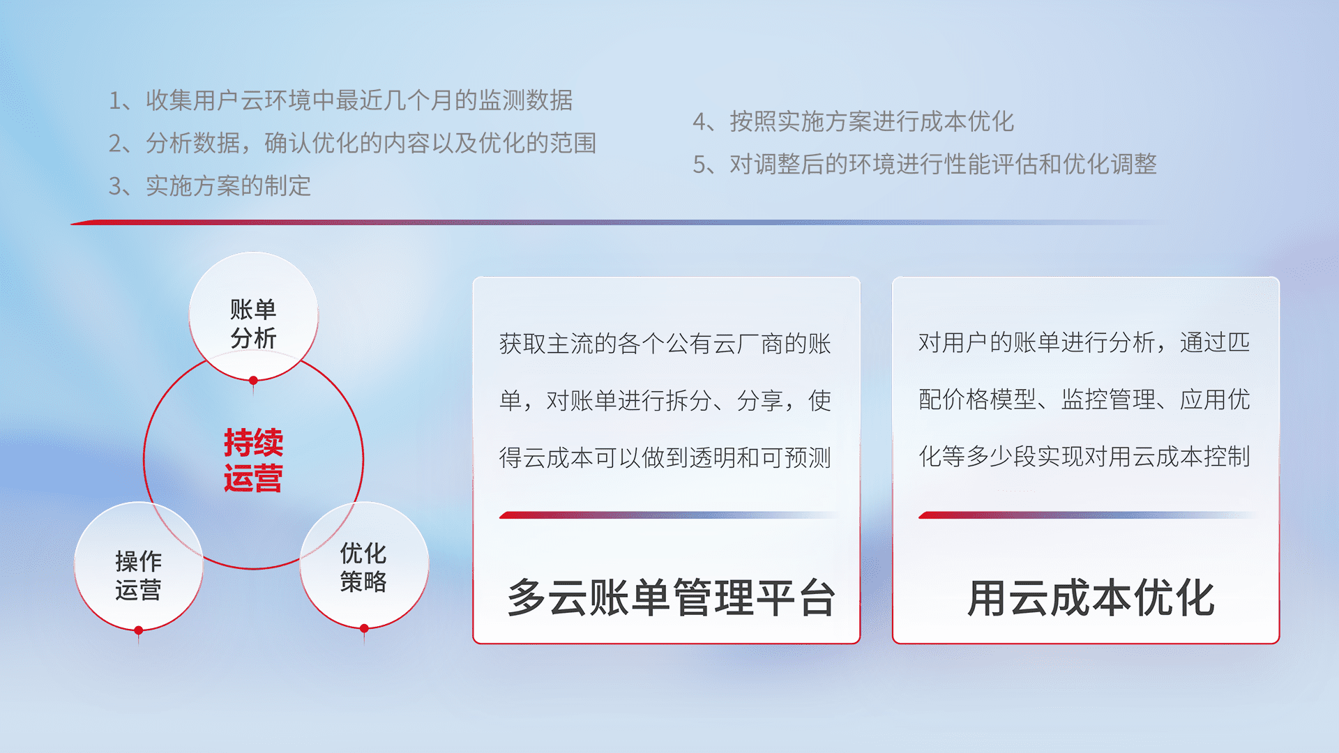 通过多云纳管,,,,以统一的资源数据模型把客户的云资源进行抽象和封装,,,进而实现对多云资源的统一操作,,,,保障云资源管理的可靠性、、、稳定性与可用性。。。量身定制化运维内容,,,,配置、、、开发运维、、、、补丁管理、、备份、、监控、、、认证和访问管理、、、、审计和日常巡检等,,,,保障在用云过程中的可靠度,,,稳定度以及高可用率。。。