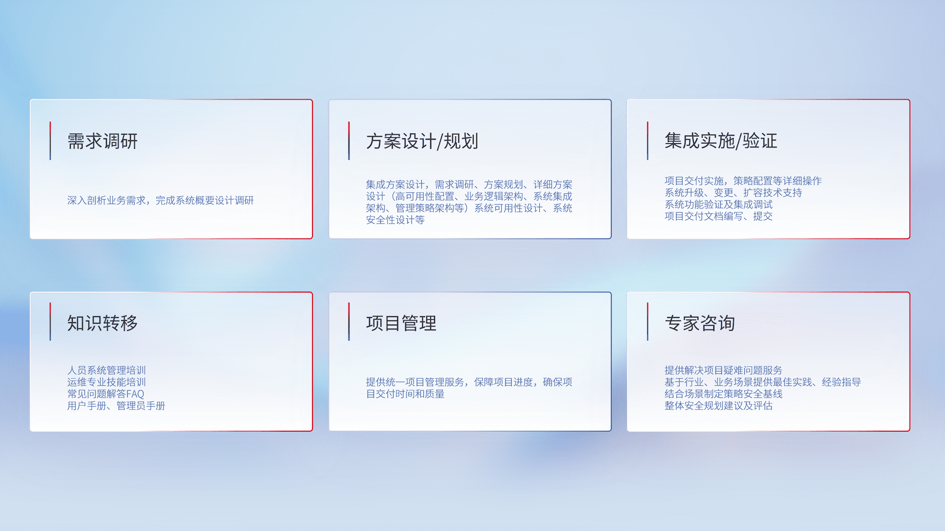 针对客户行业特性,,,将宏观的安全战略和需求,,,,通过专业的交付服务,,,实现项目落地,,为客户提供标准规范的集成交付服务。。